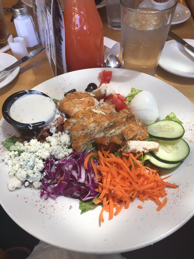 fresh romaine lettuce, grilled chicken breast, avocado, bleu cheese crumbles, grilled bacon, egg, carrot slivers, black olives, tomatoes, shredded red cabbage and Bleu cheese dressing