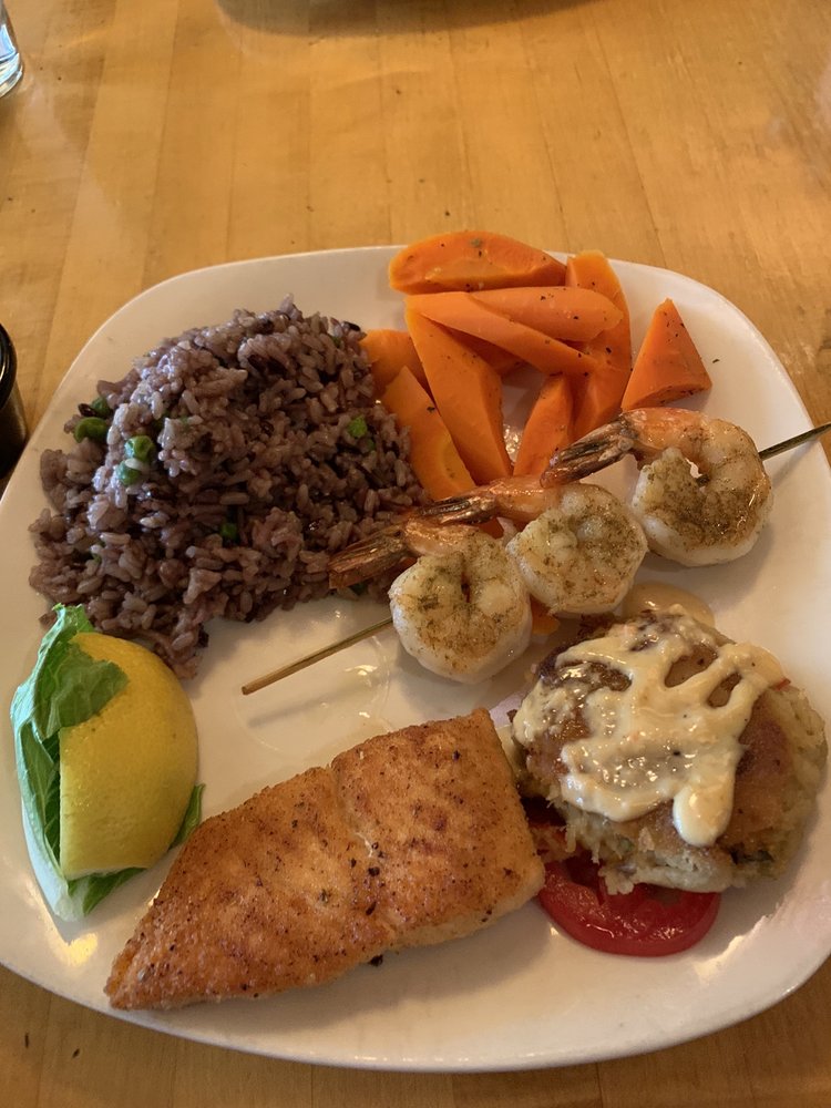 grilled prawns, petite salmon filet and a dungeness crab cake served with blended emperor rice and vegetables, served with citrus and cocktail sauce