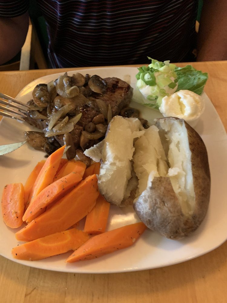 7 oz. Black Angus Top Sirloin grilled to your specifications, topped with sauteed mushrooms and onions, served with a baked potato and vegetables